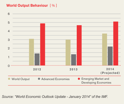 Emerging market economies slowed down during the year, growth being restricted to 4.7%, compared to 4.9% in 2012. India, Brazil and Central and Eastern Europe experienced sound growth over the year. China continued to hold its ground at 7.7% growth while the growth rate in Russia declined from 3.4% in 2012 to 1.5% in 2013. Among other countries that reported growth rates lower than 2012 who accounted for most of the decline in overall emerging markets segment were ASEAN countries, Mexico, Middle East and North African countries. Tightening credit conditions in response to the expected unwinding of quantitative easing measures adopted by advanced economies, capacity constraints and less room for policy to support growth were some of the reasons for the recorded slowdown in these emerging market economies.