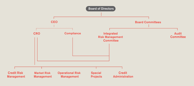 Integrated Risk Management Committee (IRMC) | Review the Bank’s risk management policies, regulatory framework and compliance. IRMC also reviews the Bank’s risk profile against the agreed risk appetite, business continuity and disaster recovery plans. | Three members of the Board of Directors, CEO, CRO, CFO, Heads of Operational and Market Risks |
