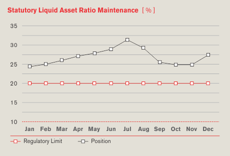 The Bank monitors number of prudential liquidity ratios as per CBSL risk directions which are discussed at ALCO, IRMC. Credit committees. Adherence to the Liquid Asset Ratio (LAR) above the statutory requirement.